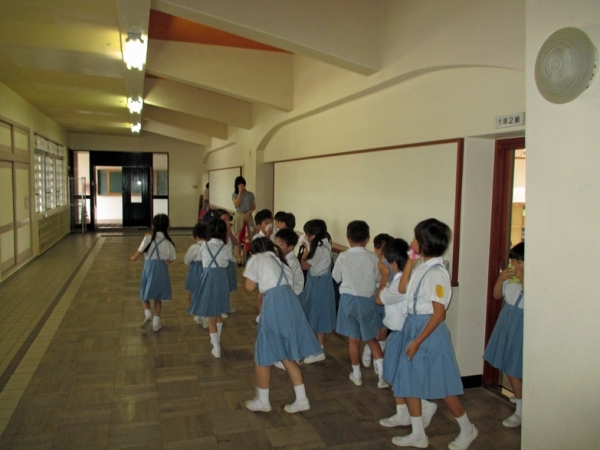 目的:地震の際、安全に気をつけ静かにすばやく避難をする。
