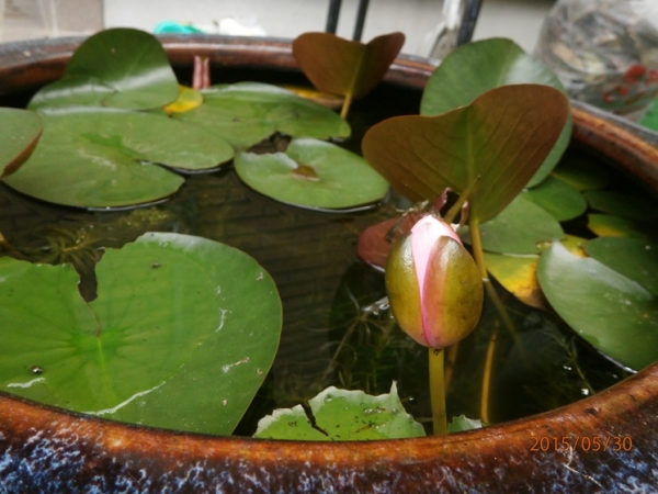 しばらくすると、クロメダカの稚魚が数匹泳ぎ始めました。身に覚えのないクロメダカが、なんで発生したか不思議なのですが、もしかたら学校から持ってきた水草に卵がついていたのかもしれません。そういうことでクロメダカが発生した原因の予想はついたのですが、もう一つ不思議なことご起こり始めました。5年ほど前から睡蓮と思われる葉が突然出だしたのです。毎年5月に入ると火鉢水槽の水面のほとんどを覆うくらいに増えるようになりました。「なんで睡蓮の葉が出てくるんだろうか?種を植えた覚えもないのになあ」と思い続けてきたのですが今年の5月25日のことです。突然つぼみみたいなものが「にょき」っと、それこそ突然に顔を見せたのです。