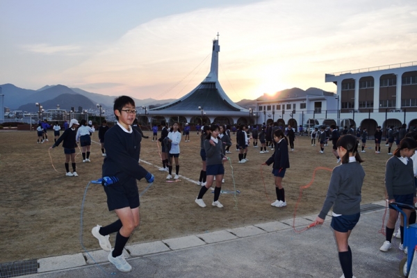 3学期に入ったとたん一気に寒くなってきましたが、南山の子供たちにとってこの寒さは関係ないようです。何度失敗しても、列の後ろに並びなおし先生に数えてもらいます。そして、誰かが合格すると自分が合格したかのようにほかの子供たちも喜びます。(なわとびをとおして、粘り強く努力する態度を身につけています。)白い息を吐きながら練習をする子供たち、応援する子供たち、それを見守る先生たちとすばらしい光景が運動場のあちらこちらで見られます。