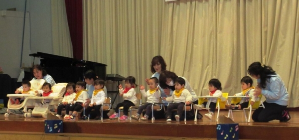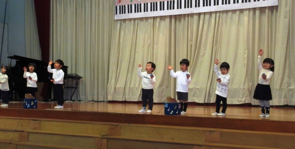 2月13日の土曜日、南山こども園の音楽会を見に行きました。昨年度までは年少さん、年中さん、年長さんたちが合奏したり、歌ったりしていたのですが、今年度からは0歳や1歳、2歳児こどもたちも出演するということで「どのようになるんだろう」と思っていたのですが、びっくりしました。
