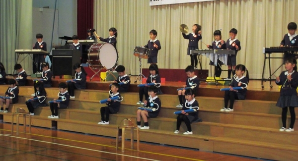 そして年長組です。「ともだちになるために」では歌に合わせて手話でも表現していました。また、「新世界より:第4楽章」は チャン、チャン、チャン、チャーチャラーン、チャン、チャン、チャーラララーンという聞きなれたフレーズですが、カタカナでしか表現できないのがもどかしいくらいすばらしい合奏でした。