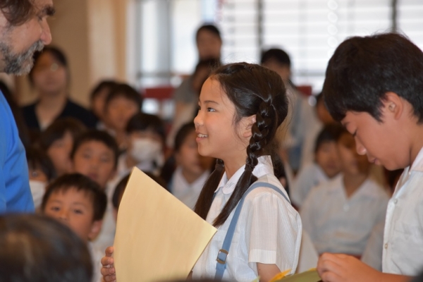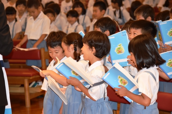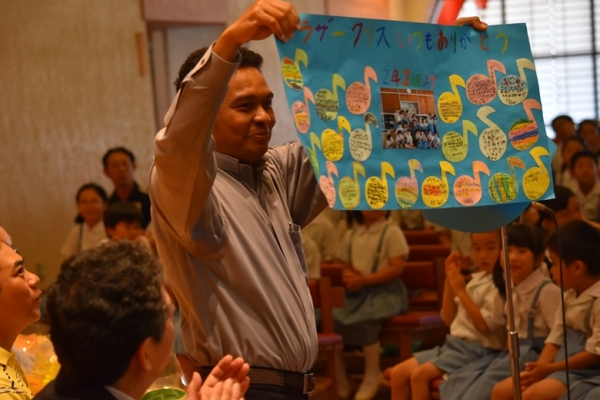 南山小学校のお父さん(神父様・ブラザー・校長先生・教頭先生)に花束と各学年工夫したプレゼントを贈りました。 大好きな神父様たちへのプレゼントに、贈る子どもたちも贈られる神父様方もみんな笑顔です。似顔絵やメッセージ・歌・クイズなど楽しいひとときとなりました。