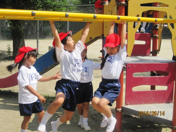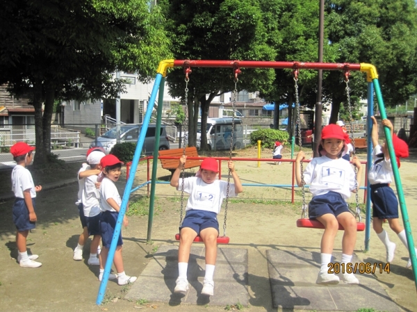 公園に着いてからは、みんなで仲良く遊ぶ・順番を守って遊ぶことをめあてに、楽しく遊びました。子どもたちに人気のブランコもちゃんと順番に並び、交代で使うことができました。公園の雲梯は学校のより小さく、1年生の子どもたちには使いやすかったのか、たくさんの子どもたちがチャレンジしていました。1時間ほどの時間でしたが、子どもたちは元気に楽しく過ごすことができました。
