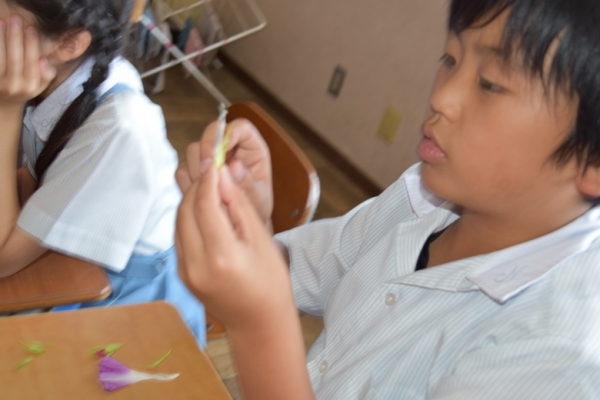 6 植物の実や種子のできかた朝顔の花をよ~く観察してみました。解剖顕微鏡や電子顕微鏡(テレビにつないでみんなで見たよ)で細かなところまで観察しました。めしべ・おしべ・花粉が見えました。