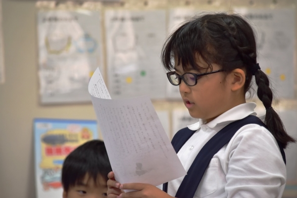 まとめとして感想を書きました。時間もおしせまっていたので、2人だけ感想を発表することになりました。修了のチャイムが鳴ったのですが、どうしても自分の感想を聞いてほしかったのでしょう。真っすぐ手を上にあげ先生の顔を見つめ「当ててください」と目で訴えます。先生も「それではどうぞ」とあてます。自分が書いた感想がプロジェクターで黒板の画面に映し出されます。みんなの前で発表した後、先生が「時間がなかったけど、○○ちゃんに当ててよかったー。」と言うと発表できた女の子は満面の笑みです。