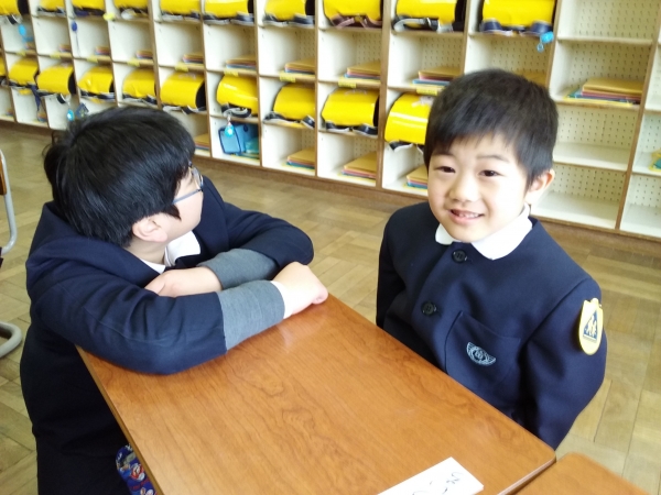水曜日に、パートナーの対面式がありました。大きな6年生との対面に、初めはドキドキしていた1年生も、優しく接してくれる6年生のことが、すぐに大好きになりました。