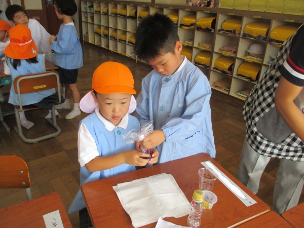 4月に2年生からもらったアサガオの種を1学期間、大事に育ててきました。7月にたくさんの花を咲かせたアサガオで「色水あそび」「たたきぞめ」「和紙ぞめ」などの花遊びを楽しみました。