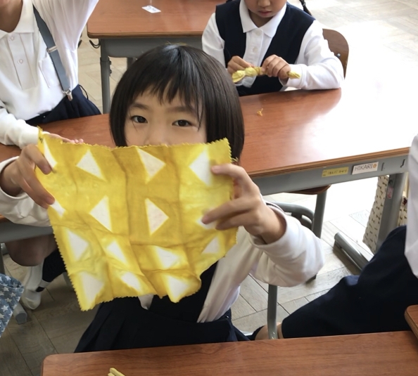 中庭にある「マリーゴールド」「ビワの葉」「ヨウシュヤマゴボウ」を自分たちで採取して、染めるための液を作りました。作った液に、折ったり結んだりした布を入れて染めました。