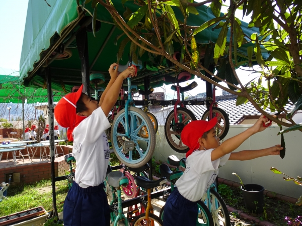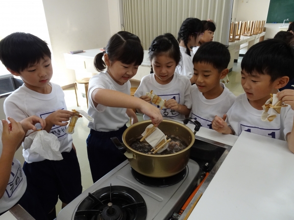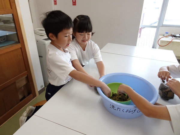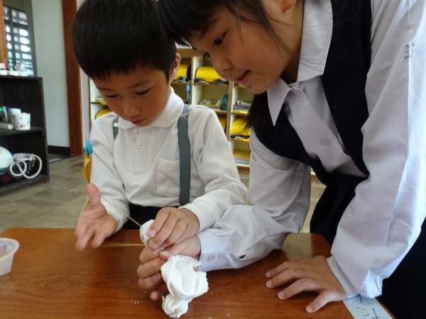 一人一人模様の違う草木染めを見て、自分の染めた布とお友達の布を比べて楽しんだり、自分の草木染めを紹介したりと思う存分楽しんでいました。