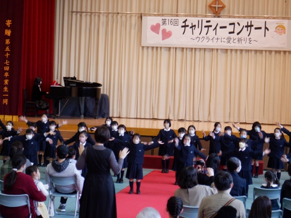 これまで、年度の終わりには、必ず、「私たちの歌声が誰かのお役に立ちますように」と願いながら、チャリティーコンサートを行ってきました。今年も対外的な演奏会を開くことができない中にはありますが、3年ぶりに、ミサでの聖歌奉仕に続き、令和5年3月19日に「チャリティーコンサート~ウクライナに愛と祈りを~」を実施することができました。今回は、在校生だけではなく、卒業した先輩方も加わり、みんなで一丸となって平和の祈りを込めたコンサートでした。このようなコンサートを行うことができ、心から感謝の気持ちでいっぱいです。募金総額は、123,319円となりました。カリタスジャパンを通してウクライナへ送ります。