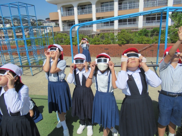 遮光板で太陽を見た時には「わぁー!!」と歓声が上がりました。太陽の位置と影の向きのひみつにも気付き、意欲的に学習に取り組んでいます。