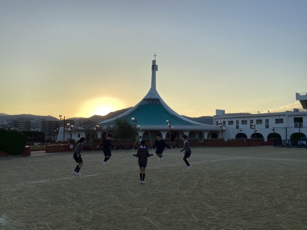 朝日が昇り始める時間からなわとびに取り組む6年生。