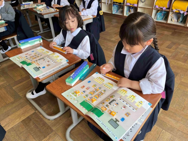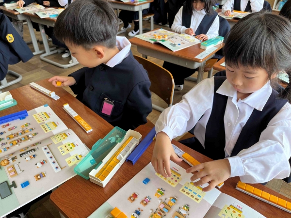 今日は、身体測定の後に算数の授業を頑張った2組です。教科書の絵の中から同じ数の仲間を探す学習です。ブロックを置いて「同じ数の物は何かな?」と探します。「たくさん見つけられたよ!」と、みんなに教えてあげることもできました。