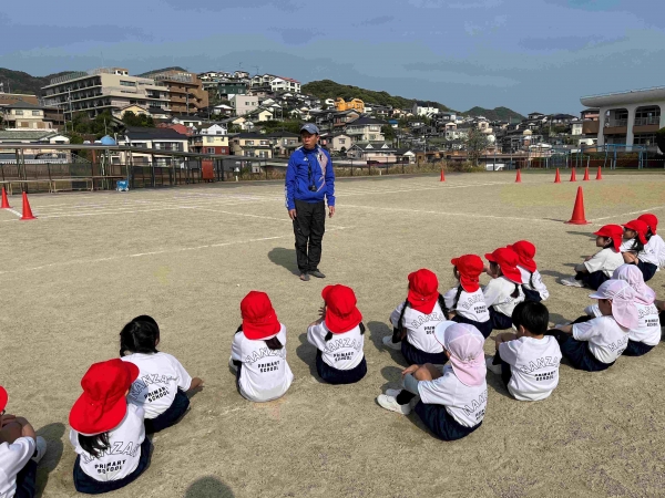 今日は、初めての体育の授業がありました。体育の先生と楽しい準備体操をして、運動をする準備は万端です!その後は5月の運動会に向けて「がんばり競走」をしました。みんな「一位になるぞ!」と一生懸命走っていました。