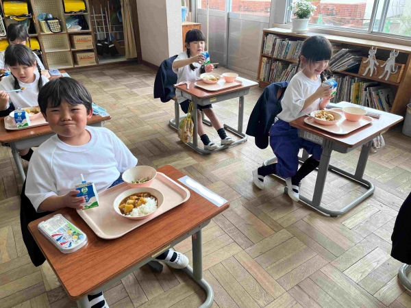今日の給食は、南山っ子も大好きなカレーです。1年生も「おいしい!」と言ってたくさん食べることができました。中にはおかわりをした1年生もいて、先生たちもとても喜んでいました。