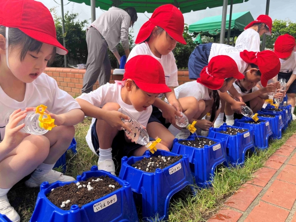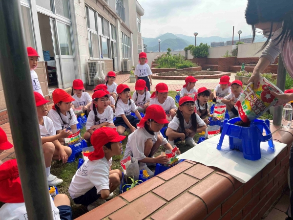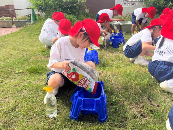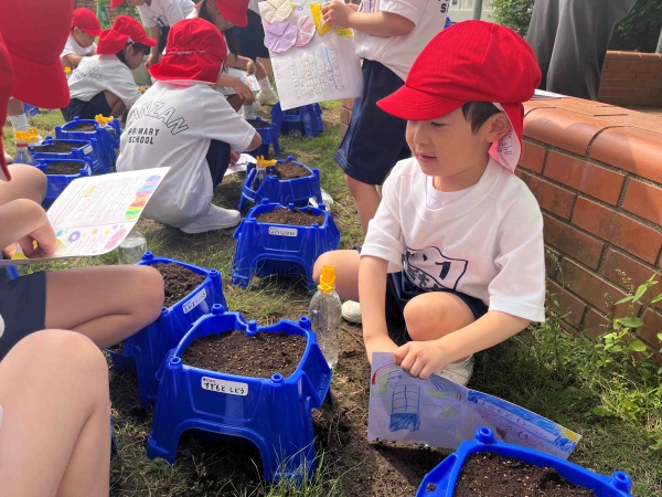 4月、2年生にもらったあさがおの種を植えました。みんなであさがおの植え方を確認して、さっそく植えていきます。植木鉢に土を入れ、1年生の小さな指で種を入れる穴をあけます。穴の中に、大切な種を入れて土のお布団をかぶせたら、肥料をまいて完了です。最後にみんなで水をあげました。みんなで大切に植えた小さな種から、どんなお花が咲くのかとても楽しみな1年生です。
