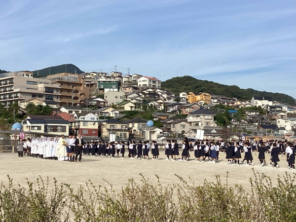 ロザリオの祈りを唱えながら、運動場を行列します