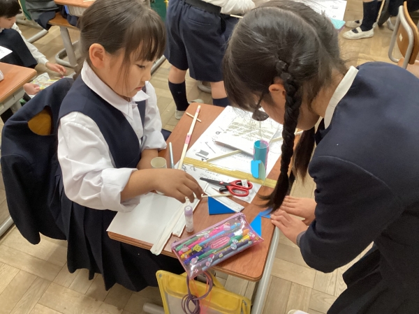 2年2組さんは、2学期に1年2組さんの教室に行き、ゴムロケットの作り方を教えてあげました。1年前は自分たちが教えてもらう立場だった2年2組さん。今年は自分たちで作り方を書いて、1年生にゴムロケットの作り方を教えることができました。着実に成長している2年2組さん。3学期もたくさんのことを学んで、かっこいい3年生になることを楽しみにしています。