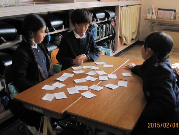 図工の学習で、紙版画にチャレンジしました。初めての紙版画に悪戦苦闘しながらも、魚やロケットをモチーフに夢を広げた作品を作りました。3年1組 3年生最後の授業参観では、グループの中にお父さん、お母さんが入られて、1年間学習してきた合科のクイズに挑戦しました。みんなで協力して取り組むことができました。3年2組 国語「かるた」の説明文の学習後、実際にかるたを作ってみんなで楽しみました。
