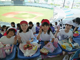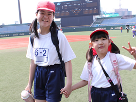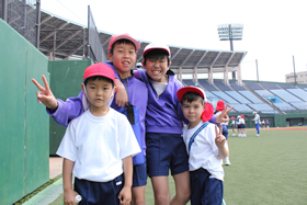 1年生を歓迎する5月の遠足では毎年、6年生と1年生は仲良く手をつなぎ、ビッグNスタジアムへ歩いていきます。広い芝生の上で野球をしたり、おにごっこをしたり楽しく遊びます。