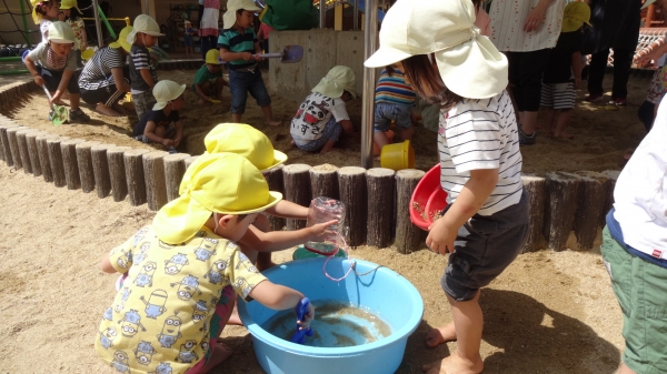 また、泥遊びをしながら、もも組のお友だちにやさしく声をかける子どもたちの姿も見られ、微笑ましく和気あいあいとした時間を過ごしました。