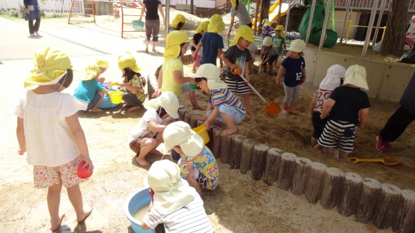 もも組のお友だちと一緒に園庭の大きなお砂場で泥んこ遊びをしました(#^^#)