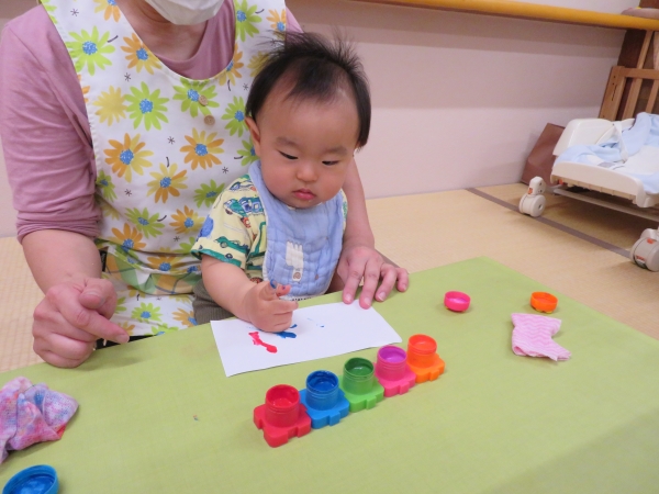 少し前に、手形・足形スタンプをした時は緊張していたお友だちも、今回の指スタンプは興味津々で保育者と楽しんでいたようです。