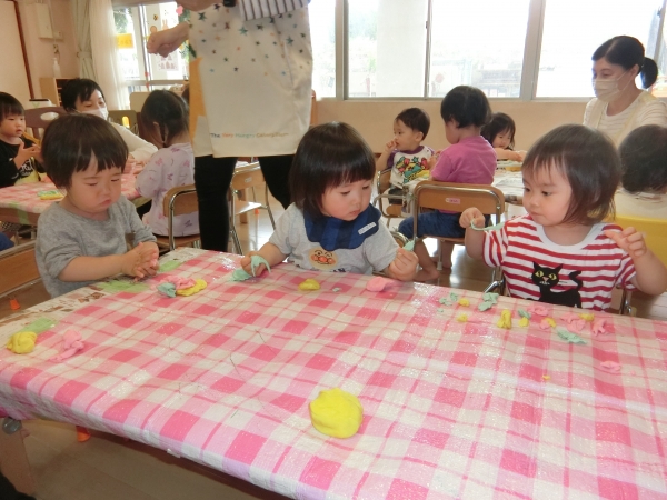 みんなで小麦粉ねんど、楽しいな(^^♪