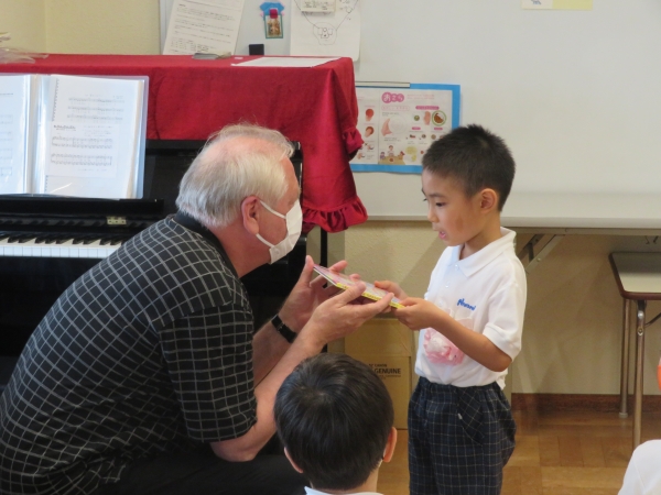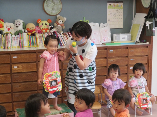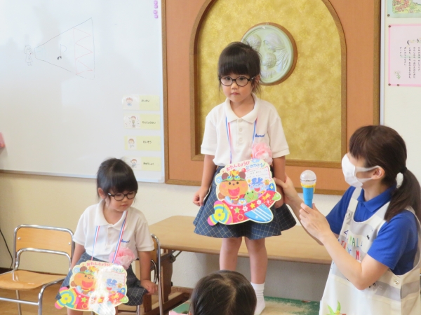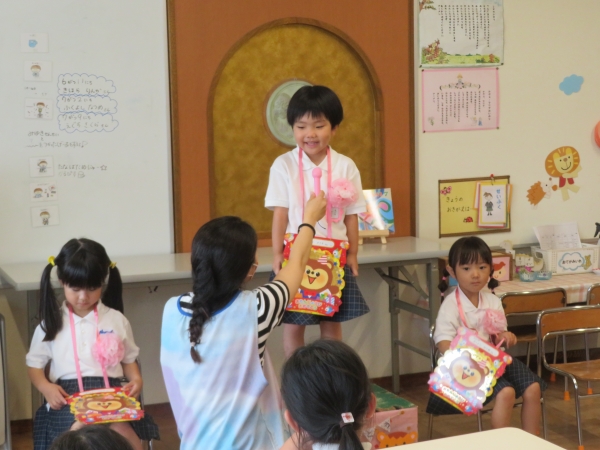 7月生まれのお友だちは、園長先生からペンダントのプレゼントをいただいで、とてもうれしそうでしたね。「好きな動物はチーターです」、「おおきなつぶのぶどうが好きです。」「ピースができるようになりました!!」などなど…ステージでも、元気にインタビューに答えてくれましたよ。