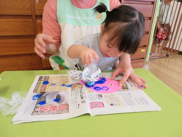 保育者と一緒にタンポを持って「ポンポン!」とスタンプする子や、以前指スタンプをしたのを思いだしたのか、自分から得意げに指でスタンプする子といて、どの子も真剣に製作していたのに感心しました!!