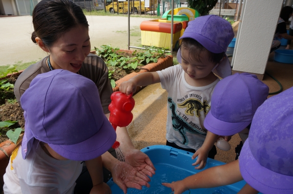 本格的な夏が始まり、天気がいい日は、もも組の子ども達も水遊びを楽しんでいます(^▽^)