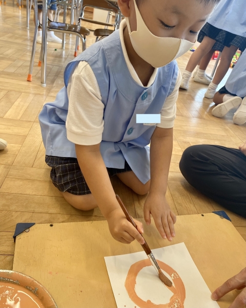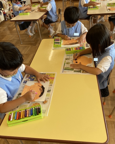 絵の具で輪郭を描いた後に、クレパスでお顔を描きました。