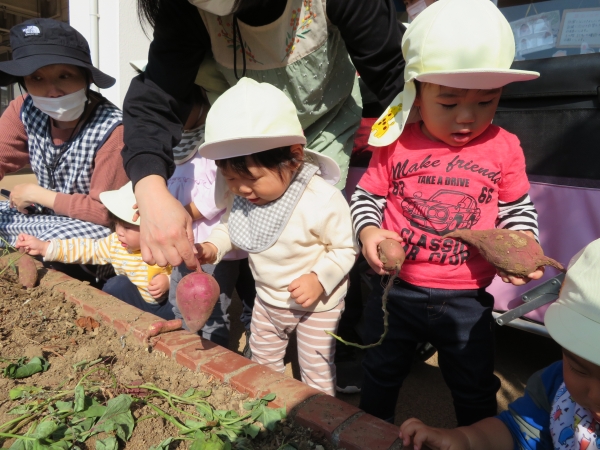 保育者が「ほら!おいもだよ!!」と手に持たせると、興味津々でみる子や「えいっ!」とおいもを投げて、代わりに石をみつけて大事そうに持つ子と様々でした。おいもと分かった子もいて「マンマ!マンマ!」と保育者に見せるしぐさが可愛かったです。