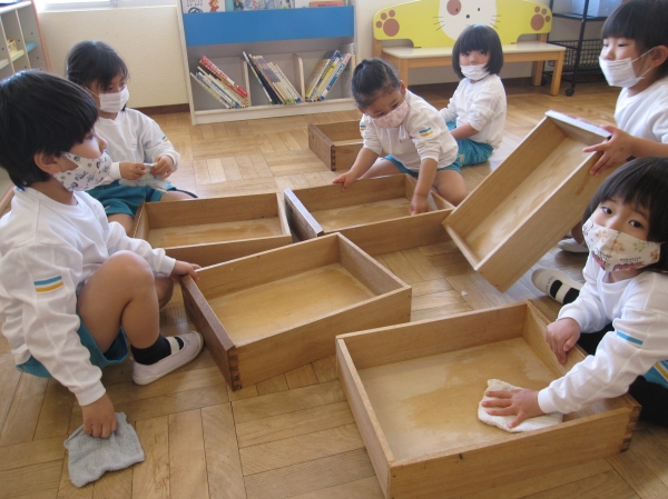 年少組になって3回目の大掃除!雑巾がけの仕方も覚え、意欲的に行う姿も見られましたよ。
