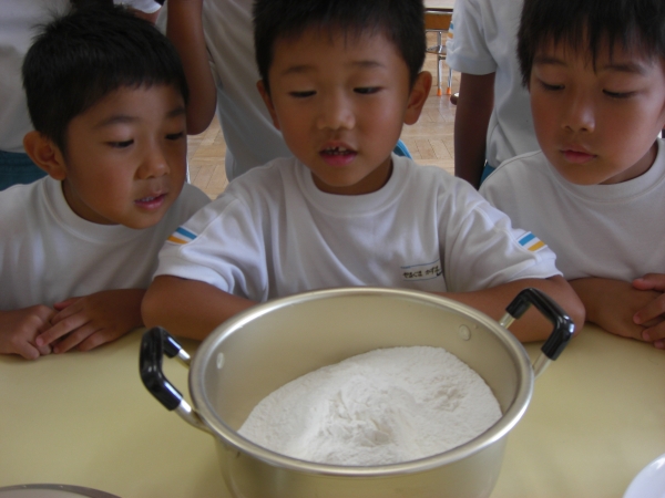 だんご粉と水を混ぜる作業にみんな興味津々。