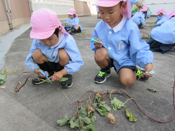 皆で、長い長い芋づるの葉を丁寧にハサミで切って紐状へ☆