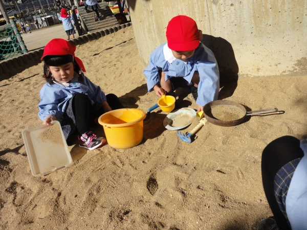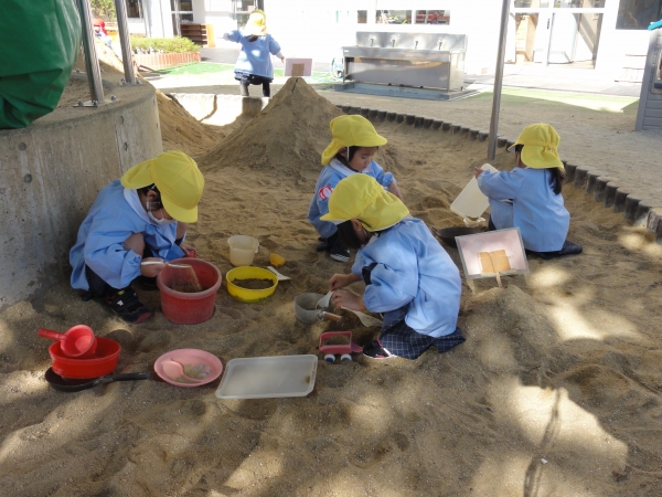 大人気「砂場遊び」では、お店屋さんごっこが流行っています。