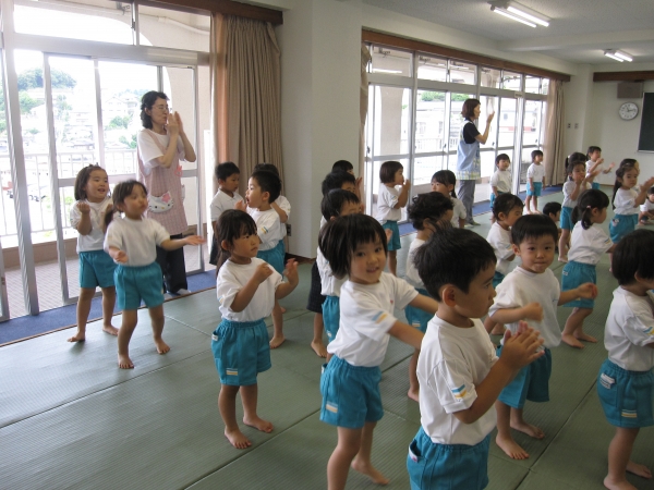 「先生の手本を見ながら一緒に踊りましょう♪」の声が聞こえると、元気に手を伸ばしたり、