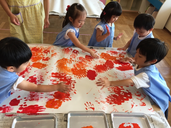 今回は、大好きな絵の具を使って両手で紙にペタペタ!!