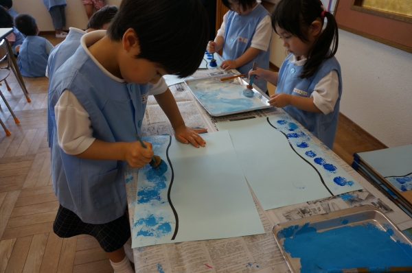 第一段階は、爽やかな水色の色画用紙に白・青・水色の三色を、タンポでポンポンポン・・・