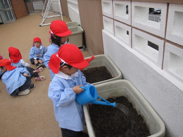 一人ずつ丁寧に種を蒔き、土のお布団をかけて、水を撒いて・・・