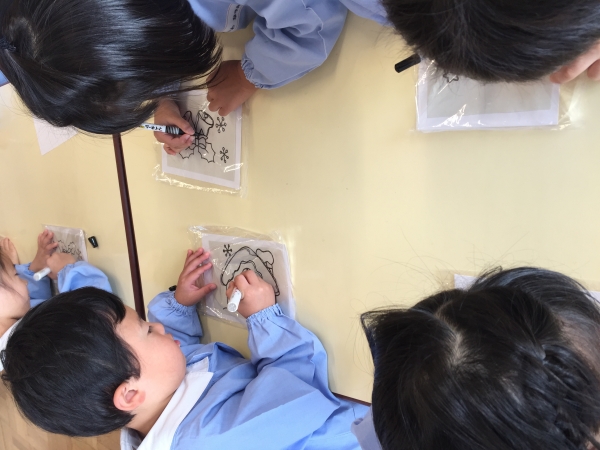 ビニール袋の中に型紙を入れて、ペンでなぞって
