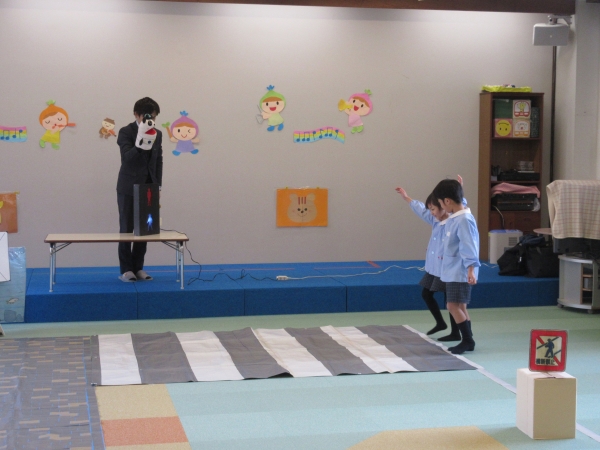 お遊戯室には、横断歩道や、信号、踏切などが再現されており