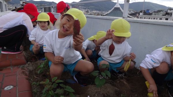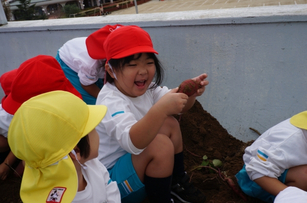 先生たちにとびっきりの笑顔で掘ったお芋を見せてくれたり、