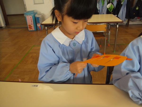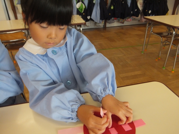 そんな年中組のお友だち☆今月はりんごと柿の台紙に格子編みを行いました!